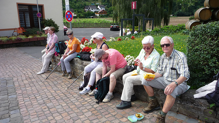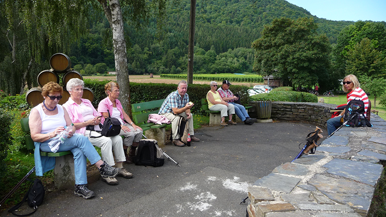 Gut gestärkt trat man den Rückweg an. Es ging bergab über den „ Dernauer Platz“, vorbei an der „Steinbergsmühle“ und wieder auf den Panoramaweg nach Rech und von dort aus entlang des Ahrufer-Wegs nach Dernau.