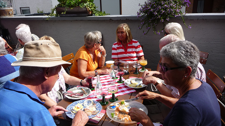 An der St. Lucia-Kirche vorbei führte ihr Weg wieder bergauf in Richtung Krausberg, wobei man unterwegs einen herrlichen Blick auf Dernau und die Saffenburg hatte. Nachdem der Alfred-Paetz-Platz erreicht war, gönnte man sich noch einmal eine kleine Trinkpause, bevor der Aufstieg zur 390 m hoch gelegenen „Alfred-Dahm-Hütte“ begann. Hier war jetzt die Zeit gekommen, um Mittagsrast zu machen.