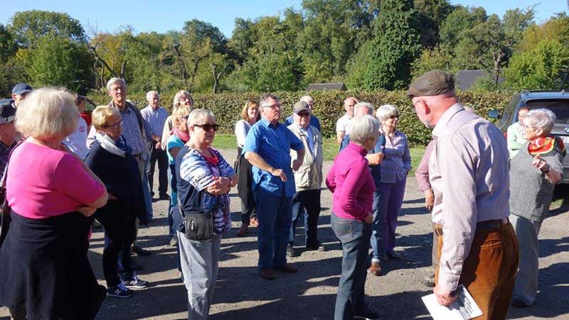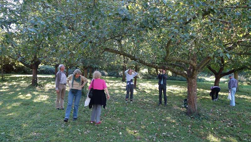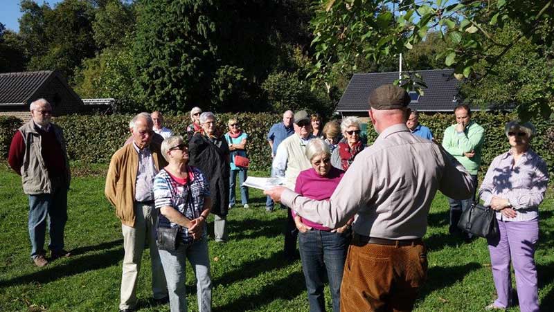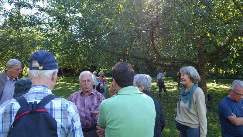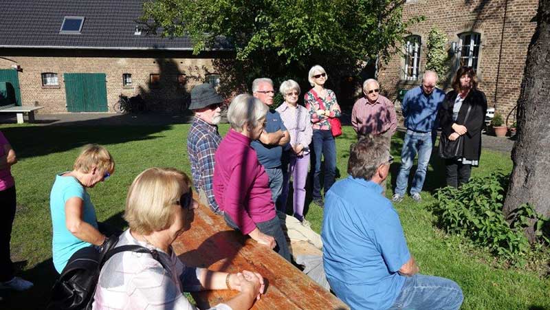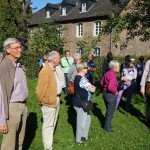 Strahlende Herbstsonne begrüßt etwa 40 Interessierte am Kloster Burbach zur Führung durch die Anlage und zum Apfelfest. Manfred Faust erläutert die Geschichte des Klosters. Gegründet und erbaut im 13. Jh., stammen die noch vorhandenen Gebäude aus dem 17./18. Jh. Nach der Säkularisation werden Kirche und Kreuzgang zerstört, die Grundrisse haben Aktive des Heimat- und Kulturvereins seit 2001 mit Buchenhecken bepflanzt und so kenntlich gemacht. Auch wurde die 50 Meter weiter südlich gelegene Obstwiese mit jungen Bäumen ergänzt. Alle Pflanzungen benötigen regelmäßige Pflegeschnitte, die mit großem Einsatz ehrenamtlich erfolgen. Hubert Heinen berichtet über seine viele Jahre angebotenen Kurse zum Obstbaumschnitt auf der Obstwiese und wie man junge Obstbäume wühlmaussicher pflanzt. Kostproben von Rheinischer Schafsnase, Krummstiel, Glockenapfel u.a. überzeugen mit der Qualität der Äpfel. Im September 2015 erhielt der Heimat- und Kulturverein für sein Engagement rund um das Kloster den städtischen Klima- und Umweltschutzpreis.