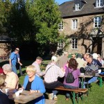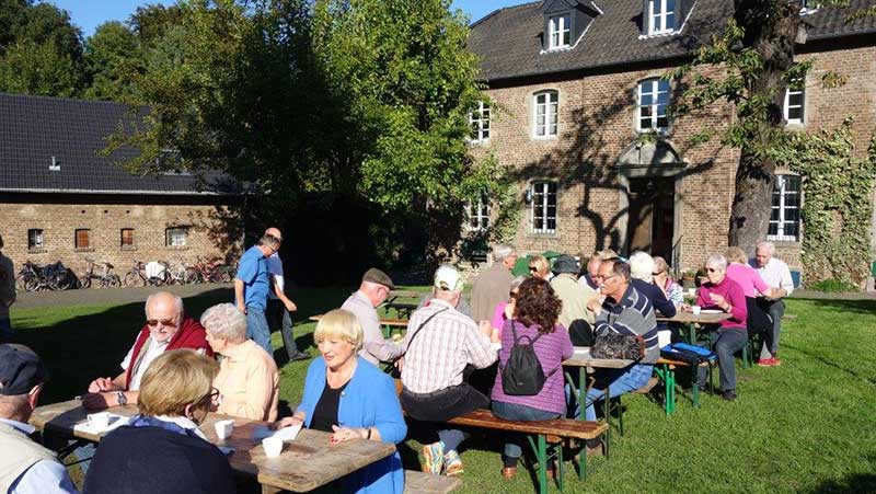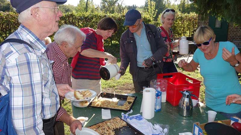 Bei Apfelkuchen, Apfelsaft von Hürther Obstwiesen, Kaffee und lebhaften Gesprächen genoss die Gruppe den sonnigen Nachmittag. Der Dank gilt besonders Herrn Kemp vom Schwimmclub für Unterstützung und Sitzgelegenheiten sowie allen anderen für die Hilfe.